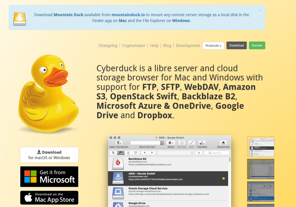s3互換のストレージなのでs3cmd等のコマンドラインツールも使えるのですが面倒なのでGUIで操作できる「Cyberduck」を使ってみます。