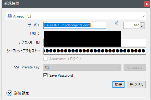 Cyberduckをインストール後、Cloud Managerで発行したアクセスキーとシークレット、エンドポイント(us-east-1.linodeobjects.com)を入力します。