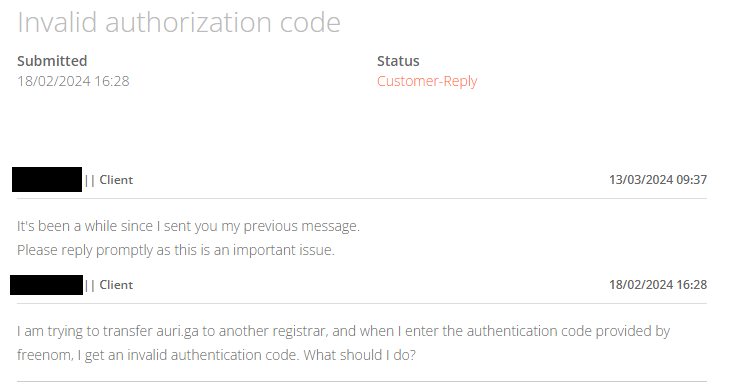 Transfer Authorization Codeが違うならFreenomに問い合わせればいいじゃない ということで問い合わせましたが、返信が来ない!!!